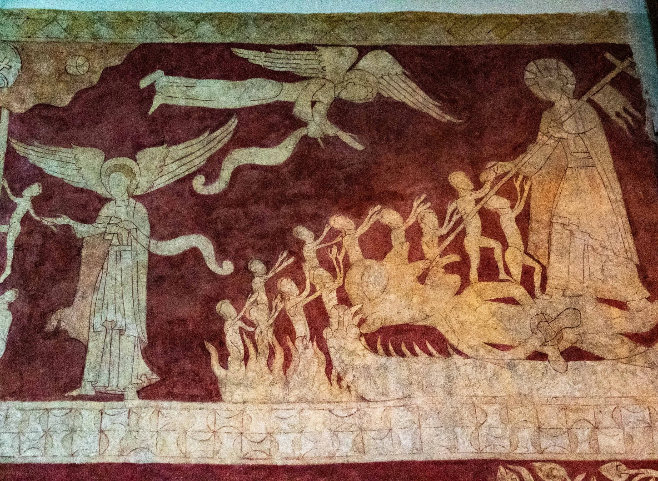 Situated in St Peter and St Paul’s Church Chaldon, it is possibly the oldest Doom painting in the UK, painted sometime around 1200 AD. It is unique, there is nothing to compare it with. Some people have suggested that it is part of the original mural but no-one has found any evidence to support this theory and looking around with my amateur eye, I couldn’t see anything that could be interpreted as being even a small bump in the white paintwork that could be concealing a fragment of another painting. The painting is believed to have been produced by an unnamed travelling monk who went from church to church. The painting is over 17 feet wide and 11 feet high. Only red and yellow ochre paints were used in the painting which again, makes it unusual. It is said to have been whitewashed when Cromwell and the puritans were in power and rediscovered in 1869. Protestants and their more extreme cousins, Puritans, believed this was a “Popish” distraction and should be whitewashed over. They did not believe in “Purgatory”, along with bishops and the Pope, Purgatory was not mentioned in the Bible. The Reformation brought about the idea that mural paintings, stained glass windows, priests in colourful garments and statues in church, were distractions and that people should simply sit in church and listen to the readings from the Bible.