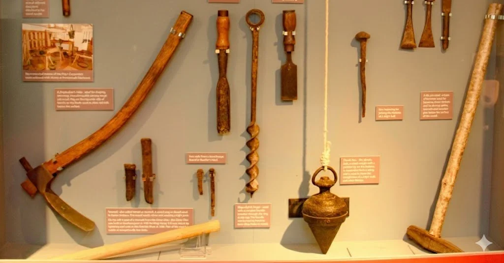 Below is a photo of some of the tools that were used in building the ships. The large tool on the left that looks like a large hoe is an “adze” which is used for shaping large beams through chopping pieces off until the right shape is obtained.